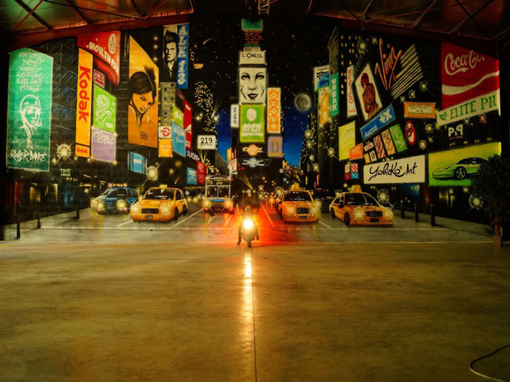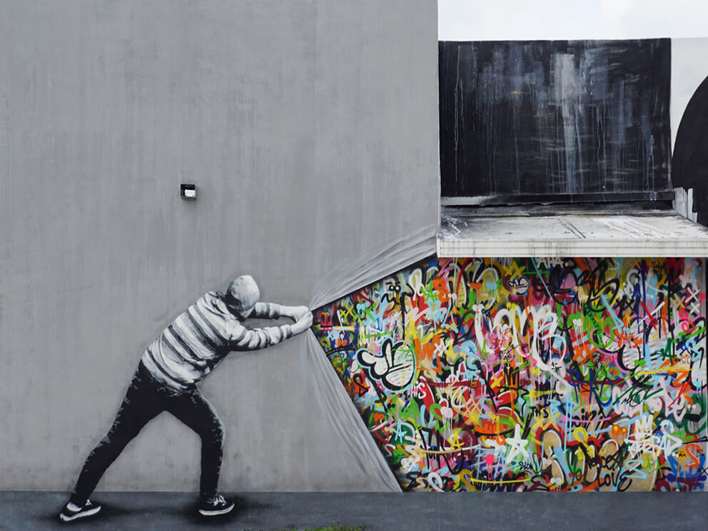 Visual Pollution di Jeaze Oner fa parte di una raffinata collezione di arte di strada in 3D in cui l'uso della prospettiva riesce nettamente ad invadere lo spazio dello spettatore, strumento caratteristico dell' artista nonché suo segno distintivo.