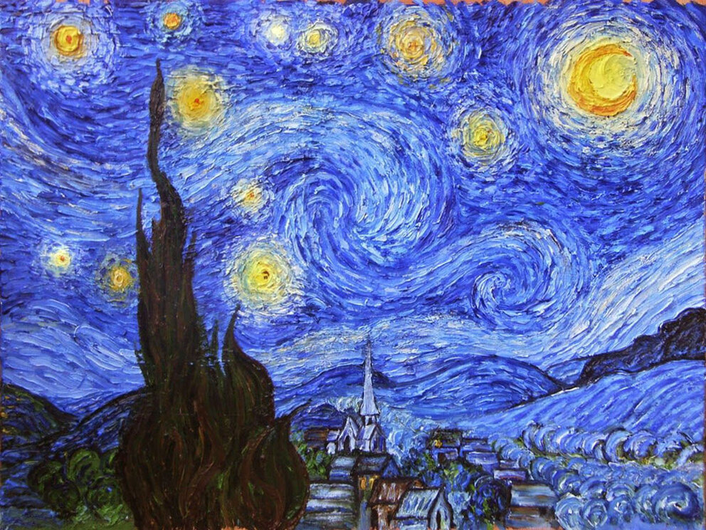 “Questa mattina ho visto la campagna dalla mia finestra molto a lungo, e prima dell’alba non c’era nulla se non la Stella del mattino, che era molto grande”. Vincent Van Gogh esordisce così in una delle sue tante lettere scritte dalla stanza del manicomio, al fratello Theo. La stella di cui parla probabilmente è Venere, la stessa che vediamo ne “La notte stellata”. Tale opera è il risultato di ciò che immagina, ciò che vede dalla sua stanza e ciò che ha visto gli anni passati nei suoi viaggi. Dunquenon ha ripreso fedelmente questa veduta notturna, bensì l'ha manipolata con mezzi plastici, interiorizzandola fino allo spasimo e trasformandola in una potente visione onirica in cui poter fare affiorare le sue emozioni, le sue paure, i suoi viaggi dell'anima. La Notte stellata, pertanto, non offre all'osservatore un'immagine fedele della realtà, quanto una forma di «espressione» di quest'ultima.