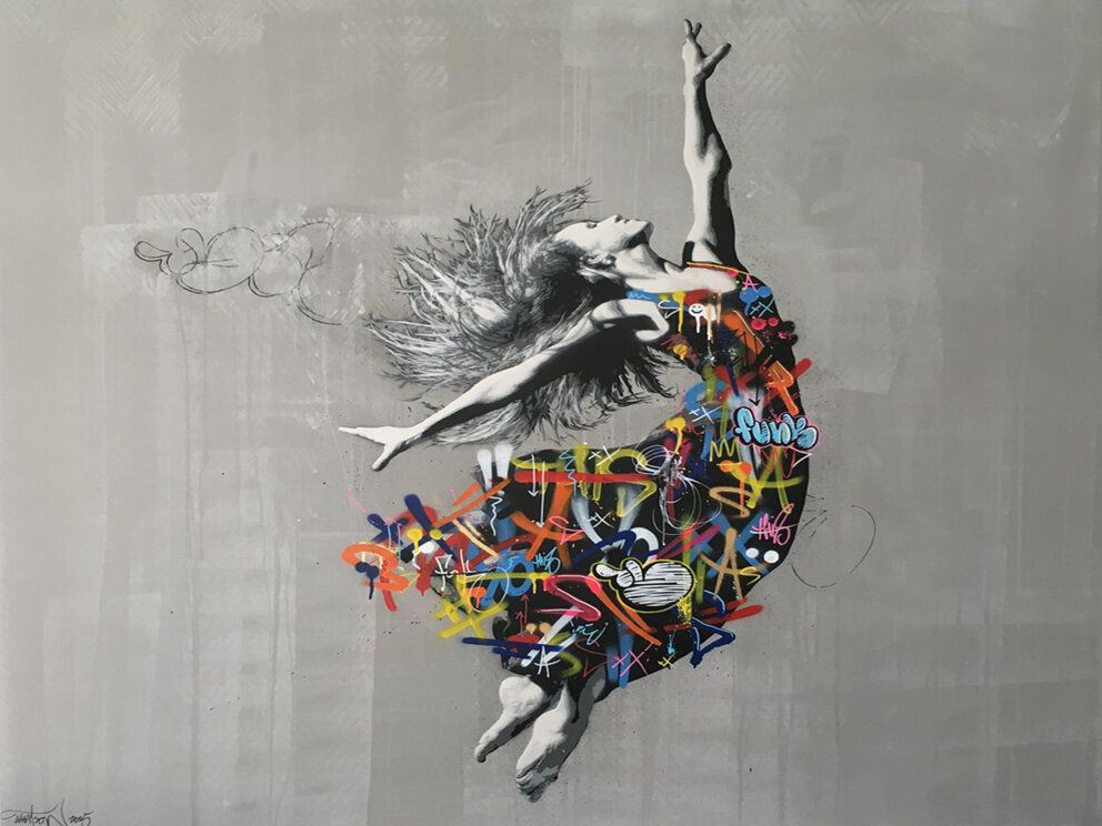 Il lavoro Martin Whatson combina due elementi in un modo unico: immagini grigie monocromatiche realizzate con stencil, ma decorate con graffiti di colori vivaci. Si ispira a persone, poster o altri graffiti e ha un debole per gli spazi urbani che sono decaduti e abbandonati. In questo graffito rappresenta in modo innovativo e sicuramente fuori dagli schemi, Dancer, una ballerina.