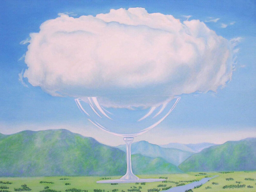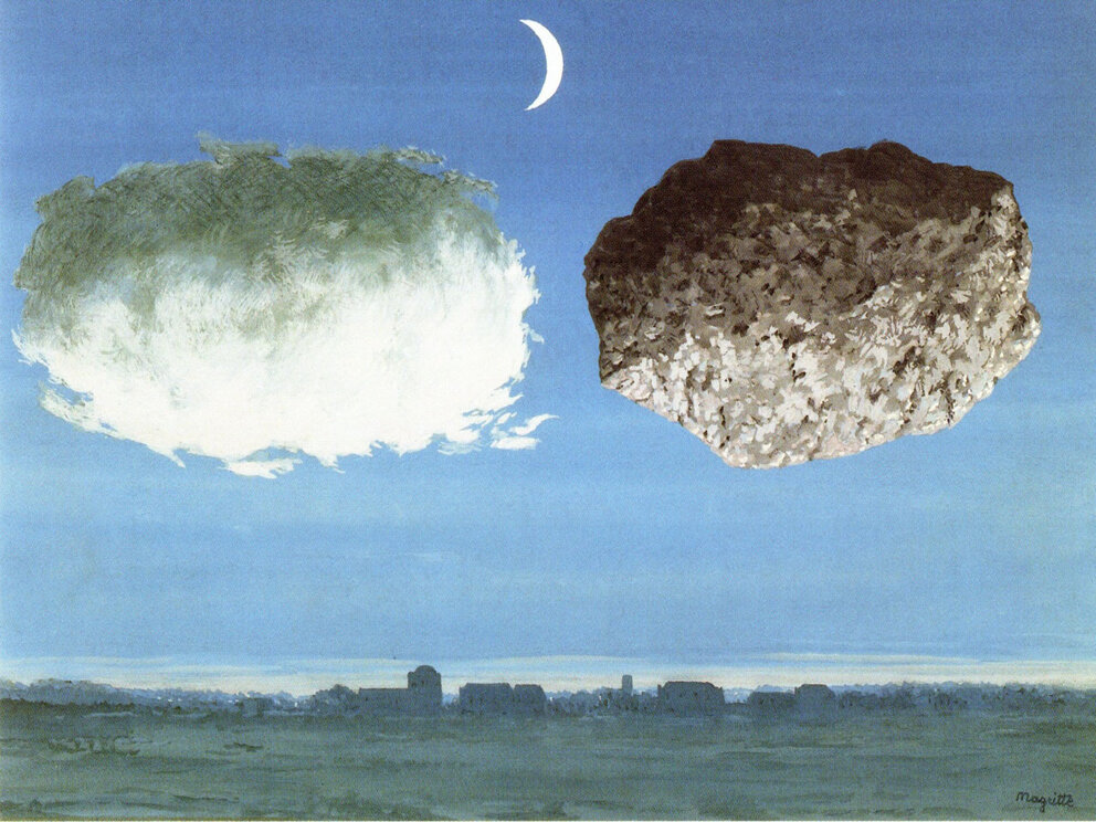 curiosità dei bambini: la sua pittura è realistica, ma anche associata ad atmosfere fantastiche e misteriose. Egli dipinge con una tecnica che crea un’illusione onirica, ritenendo il sogno una fonte di ispirazione. Il suo scopo è quello di creare un cortocircuito visivo nello spettatore, attraverso accostamenti inconsueti e deformazioni irreali, creando universi fantastici,misteriosi ed enigmatici. Uno degli elementi preferiti da Magritte nelle sue opere sono le nuvole.