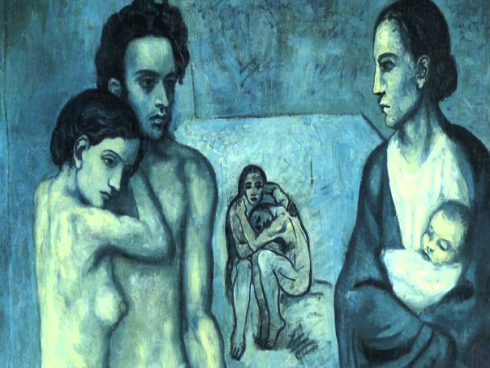 alle sole gradazioni del blu, colore che, secondo l’artista, era adeguato ad esprimere la malinconia e la mestizia che lo tormentavano in seguito a un lutto.