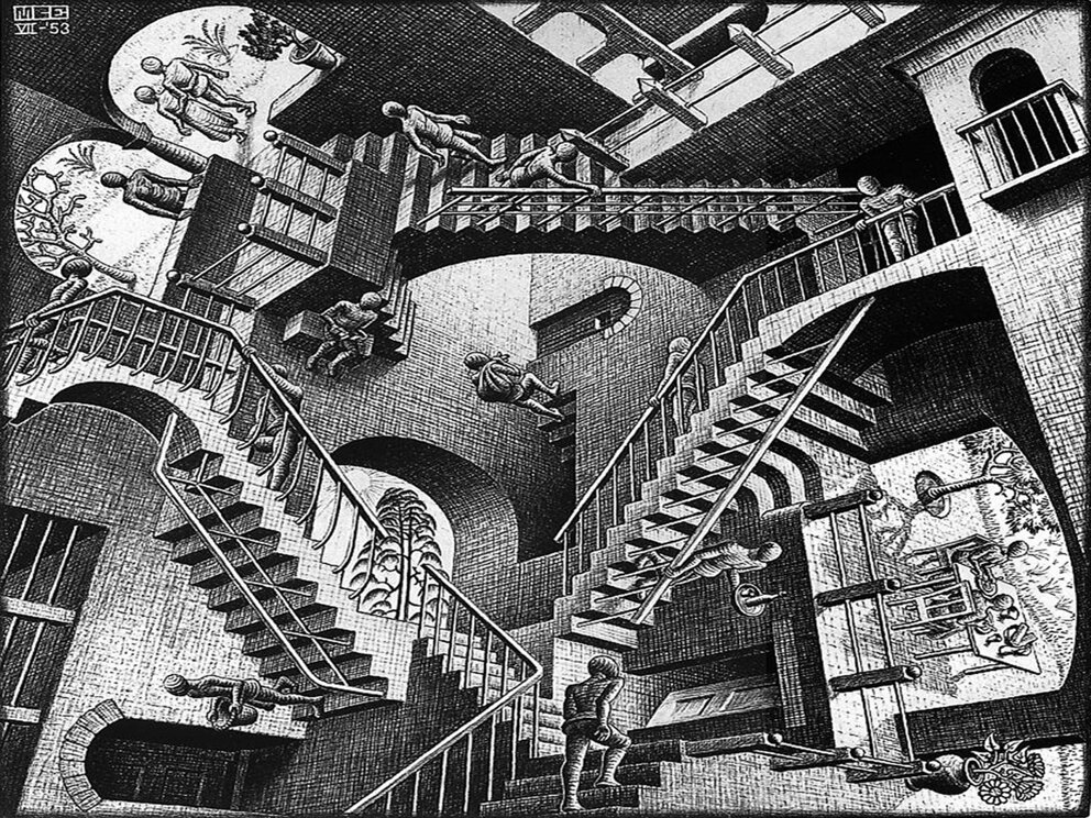 Escher è in grado di produrre scene in cui l’alto e il basso, l’orientamento degli oggetti a destra o a sinistra, dipendono dalla posizione che l’osservatore decide di prendere. Il sopra e il sotto assumono valenze estemporanee, legate al particolare che si sta osservando e a quale parte della figura rappresentata si vuole fare riferimento.