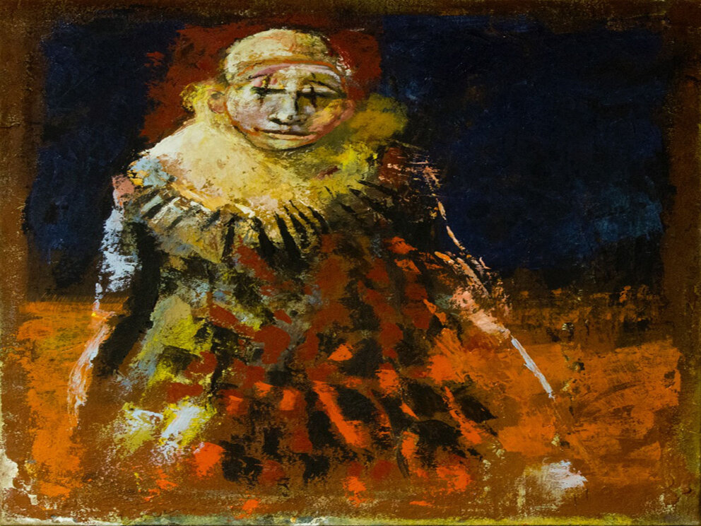 maschere dei clown. Specchi metaforici della sua vita e di quella di ogni uomo, costretti come siamo a dar spettacolo e far da spettatori in un mondo sublime e crudele, insensato e carico di attese. Un copione di poesia e ferocia, angoscia, passione e divertimento che i suoi occhi malati non hanno avuto bisogno di leggere o ripassare. Basta e avanza la sua memoria che scendendo nel paradiso-inferno del proprio sguardo interiore ha scelto come angelo guida la figura del clown.